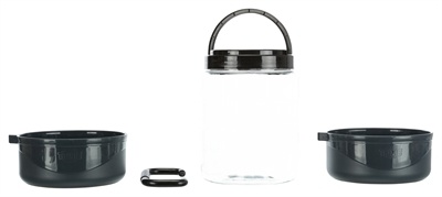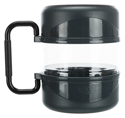 De Trixie Reisset Voerbak / Drinkbak Donkergrijs 750 ml bestaat uit een voerreservoir van 2 liter en twee slipvaste voerbakken of drinkbakken van 750 ml, compact opgeborgen voor op reis en onderweg. De handige set bestaat uit een transparante bus om voer in te stoppen, die aan de boven en onderkant een bak bevat. Deze zijn verbonden met een handvat, zodat ze stevig blijven zitten en je hele set als één geheel eenvoudig mee kunt nemen. Wanneer je jouw hond eten wilt geven, haal je simpelweg de twee bakken van het reservoir af, zet ze neer en giet er voer uit de bus in. De voerbakken zijn slipvast door de rubberen onderkant, zodat jouw dier rustig kan eten. Het reservoir kun je weer afsluiten met zijn eigen dop, die ook voorzien is van een handvat.